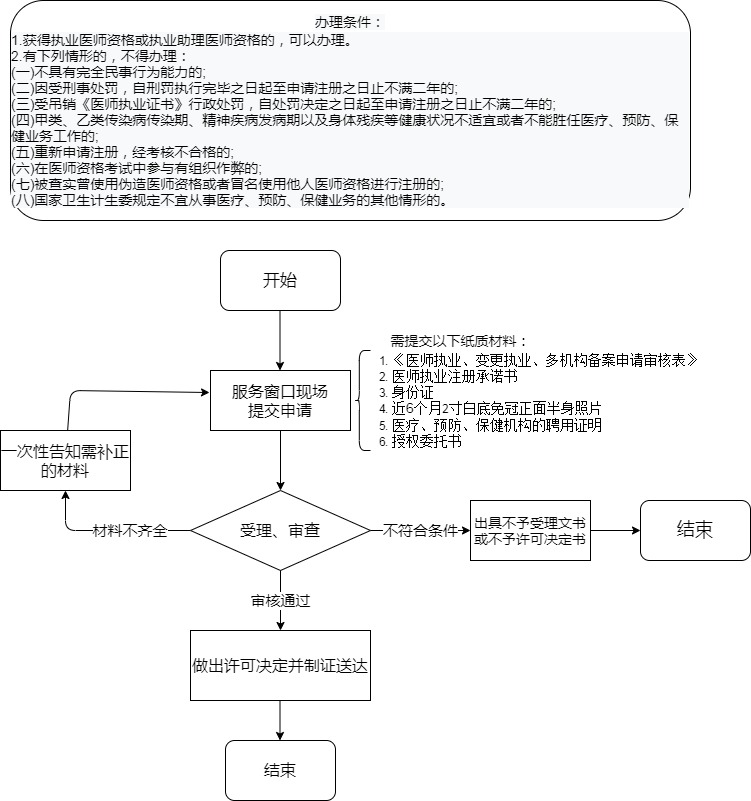 (二)有下列情形的,不得辦理:(一)不具有完全民事行為能力的; (二)因受刑事處罰,自刑罰執行完畢之日起至申請注冊之日止不滿二年的; (三)受吊銷《醫師執業證書》行政處罰,自處罰決定之日起至申請注冊之日止不滿二年的; (四)甲類、乙類傳染病傳染期、精神疾病發病期以及身體殘疾等健康狀況不適宜或者不能勝任醫療、預防、保健業務工作的; (五)重新申請注冊,經考核不合格的; (六)在醫師資格考試中參與有組織作弊的; (七)被查實曾使用偽造醫師資格或者冒名使用他人醫師資格進行注冊的; (八)國家衛生計生委規定不宜從事醫療、預防、保健業務的其他情形的。