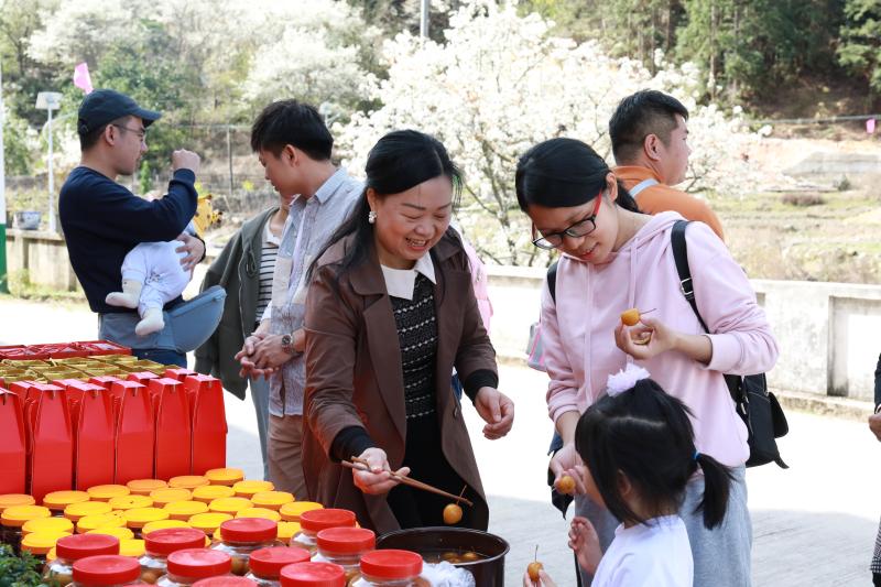 讓游客鐘情于漳溪的,除了春天賦予的自然之美,還有那意料之外的家門(mén)口、梨樹(shù)下擺起的攤位。在村民李香梅攤位前,“浸水梨”“梨果干”“梨果酒”等土特產(chǎn)品吸引眾多游客駐足。當(dāng)產(chǎn)品成交,聽(tīng)到游客評(píng)價(jià)她釀的梨花酒“口感柔和,有點(diǎn)白蘭地的味道”時(shí),李香梅笑得合不攏嘴:“我這個(gè)酒就是梨花結(jié)果釀的,是純天然的綠色食品。”