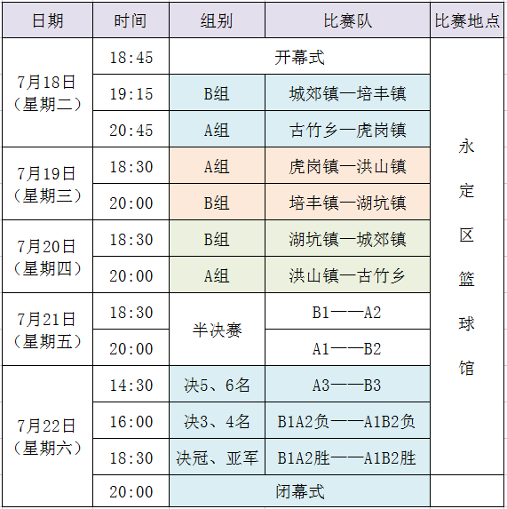 7月18日,永定區(qū)第九屆“和諧杯”男子籃球精英賽將在永定火熱打響。屆時,6支“三大杯”冠亞軍球隊在永定區(qū)體育中心籃球館展開精彩較量,上演籃球盛宴。據(jù)悉,本次大賽開幕式將于18日18:45在永定區(qū)體育中心籃球館舉行,隨后舉行揭幕戰(zhàn),由城郊鎮(zhèn)對陣培豐鎮(zhèn)代表隊。